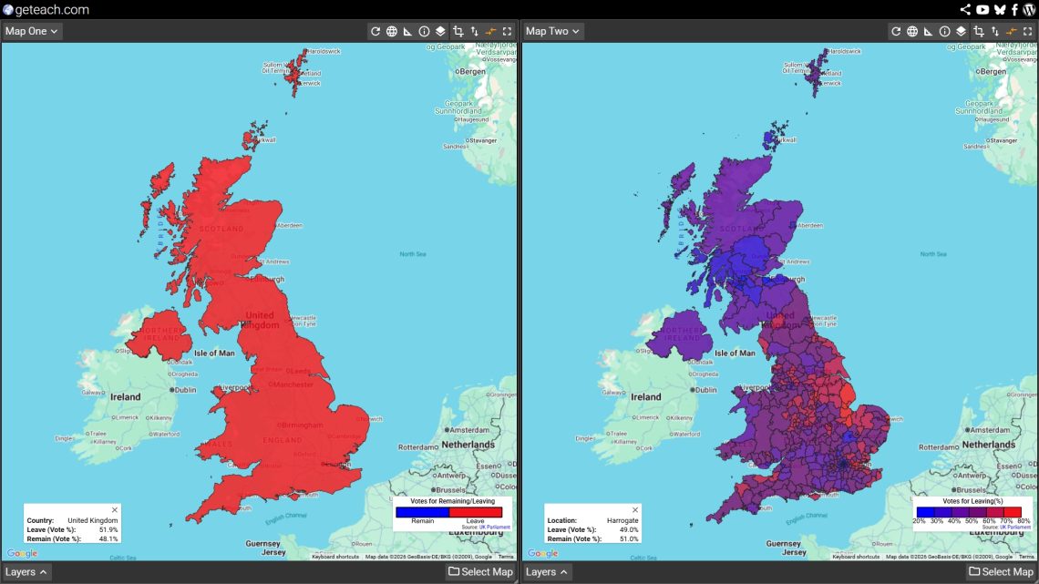 If you look only at the final national score—52% to 48%—you might assume the entire country was evenly divided. But geography tells a different story. The vote fractured the UK along national borders, regional economies, and urban/rural divides. In this activity, we will use maps to uncover exactly where the UK divided, why those divisions happened, and what it tells us about scale, supranationalism, and global trade.